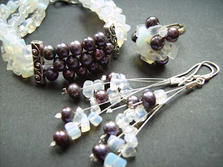 Materiały: perły naturalne (fioletowe), kamień naturalny- opal, elementy posrebrzane, srebro