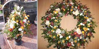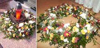Dekoracja nagrobka- wieniec i bukiet z chryzantem