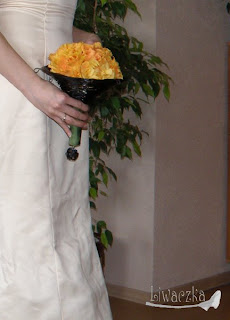 Bukiet ślubny wykonany w mikrofonie z drucianą kryzą oraz przypinka...żelazna Marie